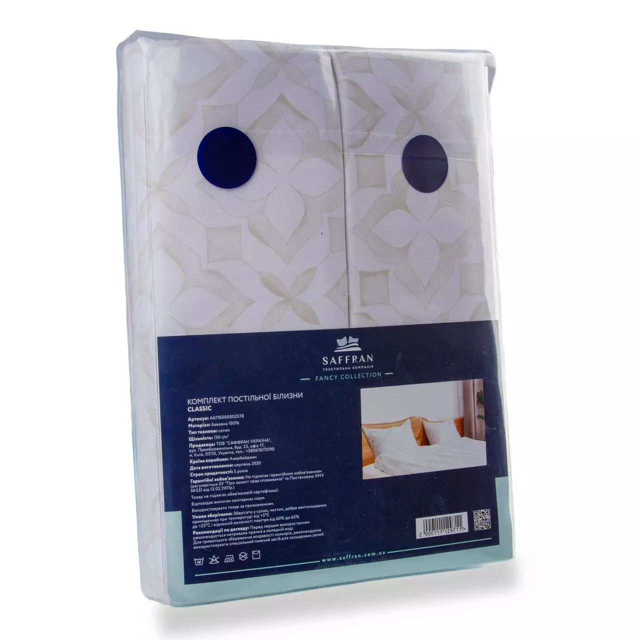 Комплект постільної білизни двоспальний сатин "Classic". Комплект виготовлено з бавовняної тканини, ніжна структура і оригінальний дизайнерський малюнок. Тканина міцна і легка, дихаюча, гідроскопічна, не електризується і не викликає алергії. Постільна білизна легка у використанні, довговічна, добре зарекомендувала себе при пранні: не втрачає форму і не линяє. Виготовлено в Азербайджані. Цей комплект є найкращим варіантом для подарунку Вашим близьким або знайомим.