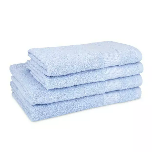 Рушник махровий з декоративним бордюром, колір блакитний. Це 100% натуральний рушник з високою і м'якою махровою петлею. Сучасний бордюр рушника має ширину 5 см. Рушник не линяє, стійкий до стирання і прання. Цей рушник є чудовим варіантом для домашнього використання, салонів краси і кращим співвідношенням ціна-якість.